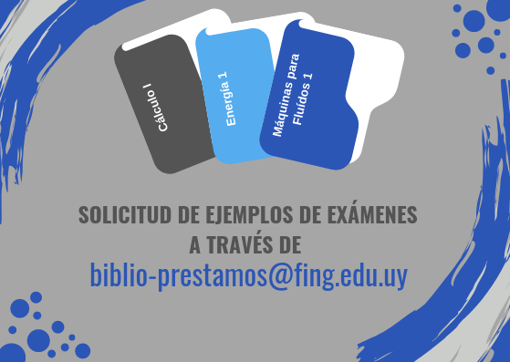 A través del correo electrónico biblio-prestamos [at] fing.edu.uy (biblio-prestamos[at]fing[dot]edu[dot]uy) se puede solicitar ejemplos de exámenes de períodos anteriores de la Facultad.