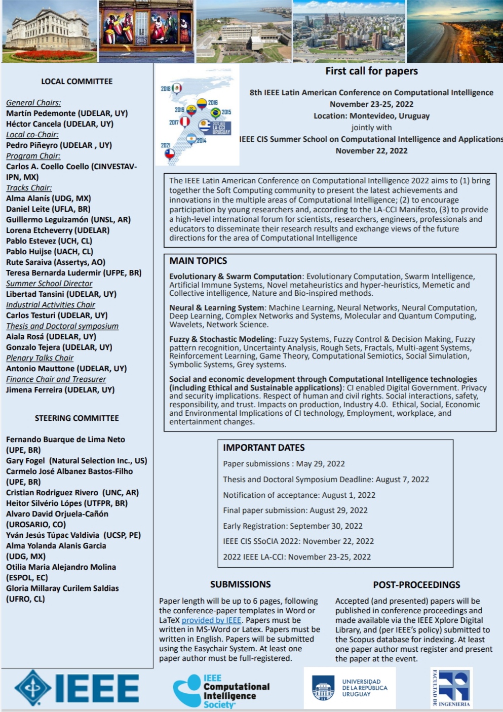 Del 22 al 25 de noviembre de 2022 en la ciudad de Montevideo, se realizará el 8° Congreso Latinoamericano IEEE sobre Inteligencia Computacional junto con Escuela de verano IEEE CIS sobre aplicaciones e inteligencia computacional