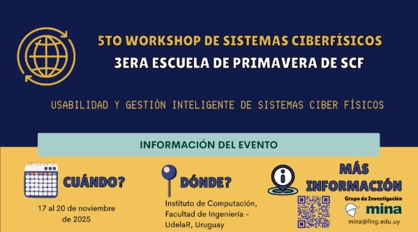 Del 17 al 20 de noviembre de 2025 se realizará el 5° Workshop en Sistemas Ciber Físicos (SCF) y la 3er Escuela de primavera de SCF, lo que consistirá en diversas actividades como cursos y charlas a cargo de especialistas nacionales y del exterior.