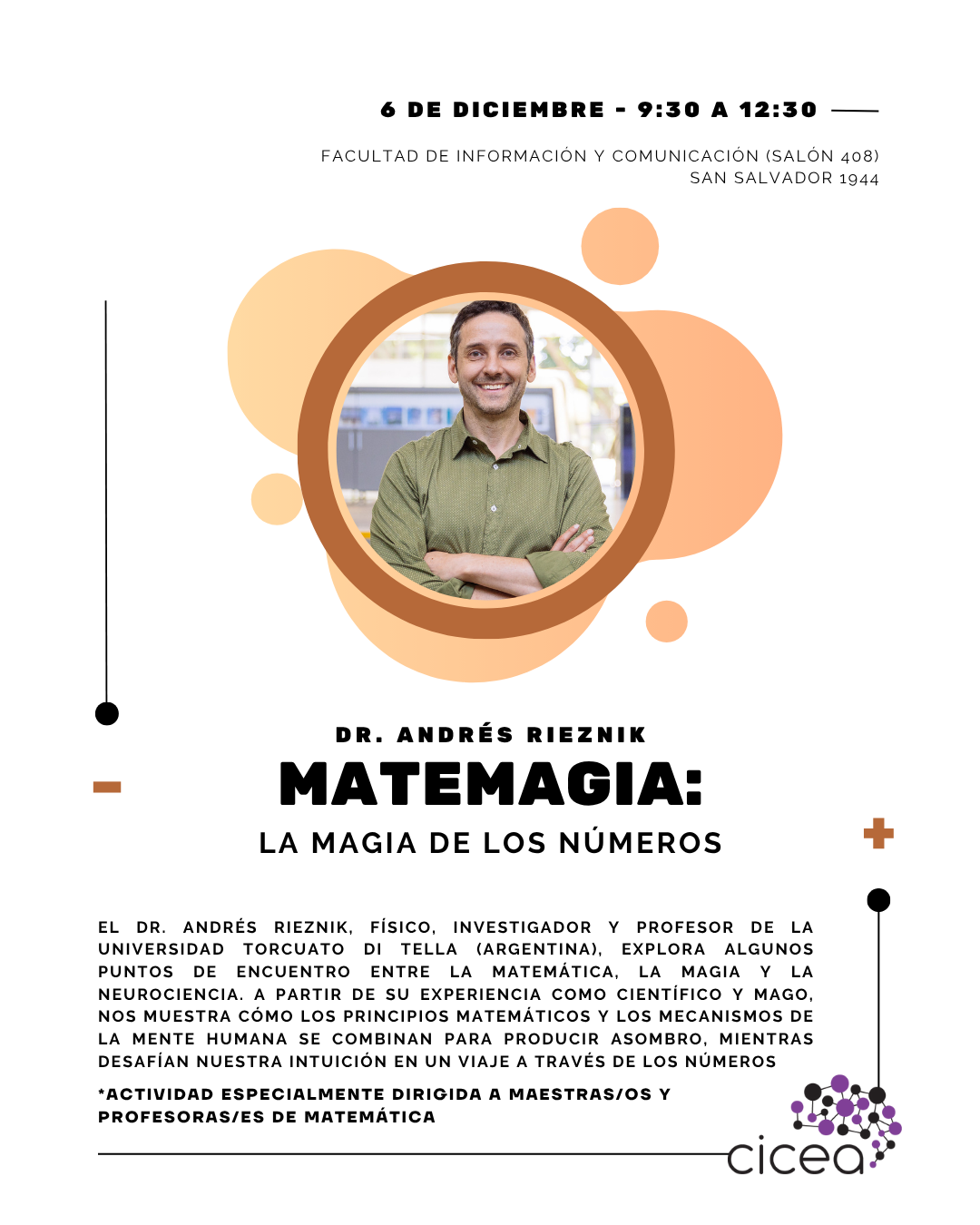 El próximo 6 de diciembre se realizará la presentación Matemagia: la magia de los números. El Dr. Andrés Rieznik, físico, investigador y divulgador científico de la Universidad Torcuato Di Tella (Argentina), explorará algunos puntos de encuentro entre la matemática, la magia y la neurociencia. A partir de su experiencia como científico y mago, nos muestra cómo los principios matemáticos y los mecanismos de la mente humana se combinan para producir asombro, mientras desafían nuestra intuición en un viaje a través de los números.