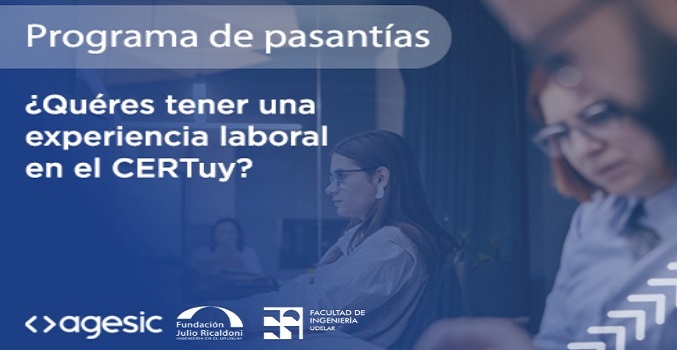 La Agencia de Gobierno Electrónico y Sociedad de la Información y del Conocimiento (AGESIC), la Fundación Julio Ricaldoni (FJR) y la Facultad de Ingeniería de la Universidad de la República (Fing – Udelar) lanzan la primera edición del Programa de Pasantías en Ciberseguridad.