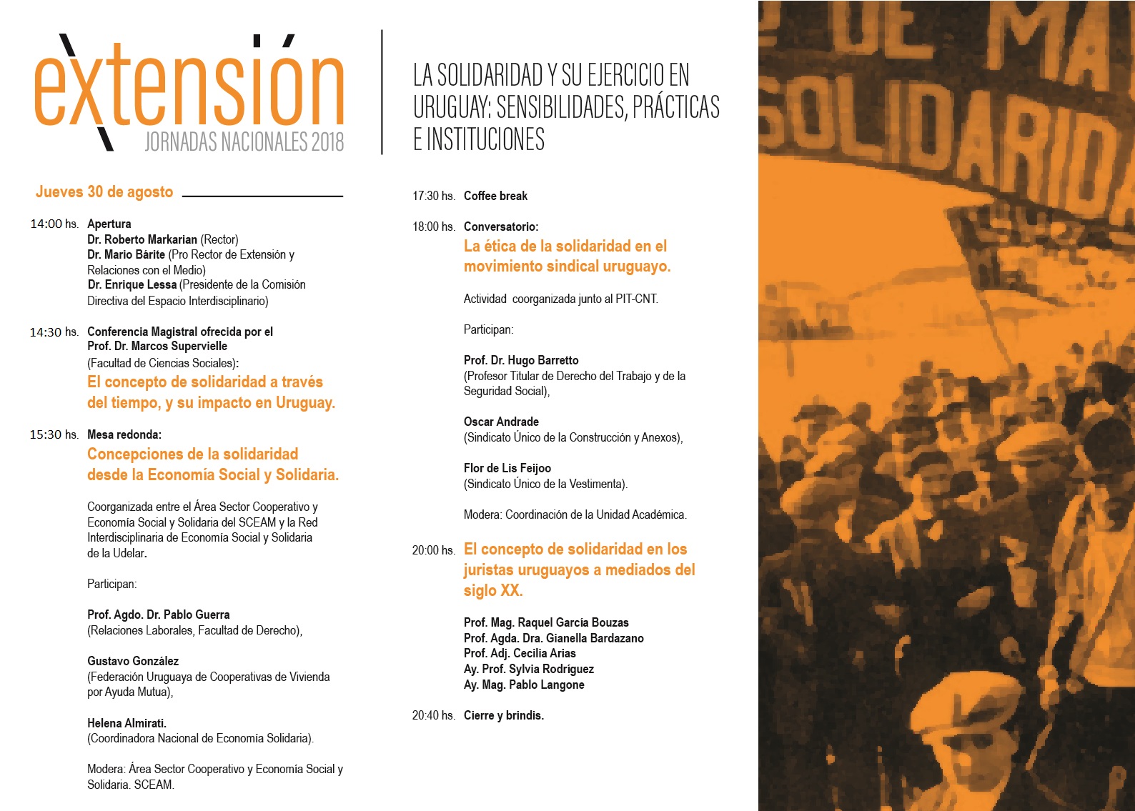 Por este intermedio invitamos cordialmente a Ud. a participar en la Jornada "La solidaridad y su ejercicio en Uruguay: sensibilidades, prácticas e instituciones", la que se desarrollará en la Sala Maggiolo del edificio central de la Universidad, el próximo 30 de agosto desde las 14 horas.