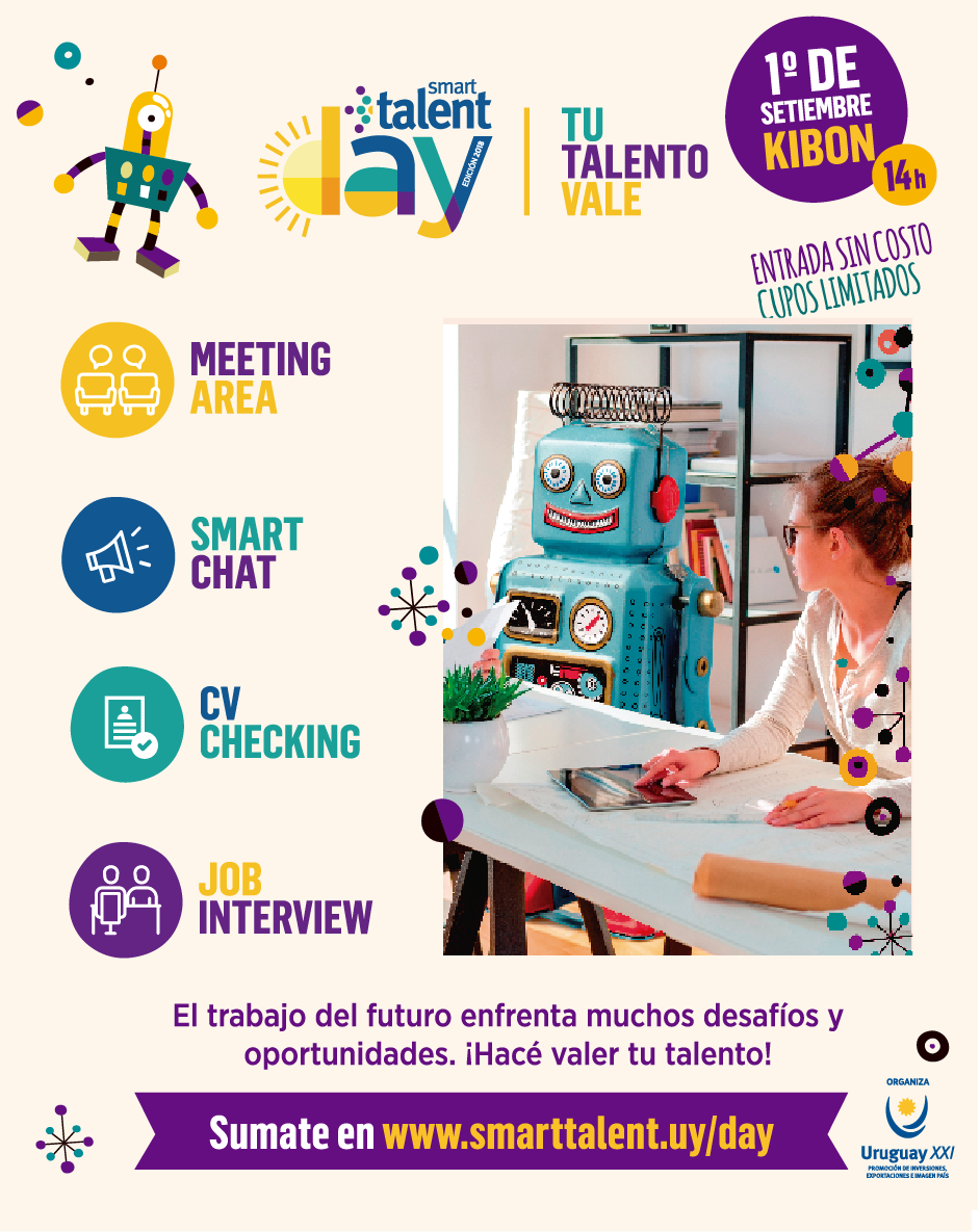 Smart Talent Day es un evento organizado por Uruguay XXI que reune a personas interesadas en trabajar desde Uruguay hacia el mundo, empresas exportadoras de servicios e instituciones educativas, que cuenta con tres espacios: Meeting Area, Smart Chat y CV checking.