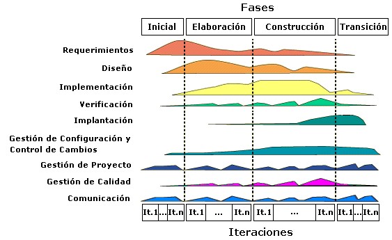 El gráfico muestra como varía el énfasis o dedicación con el paso del tiempo (según RUP).