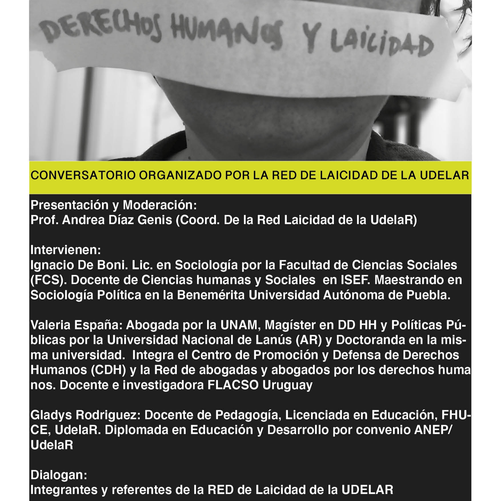 El jueves 24 de setiembre, a partir de las 18 horas, se desarrollará el Conversatorio Derechos Humanos y Laicidad, organizado por la Red de Laicidad de la Udelar.