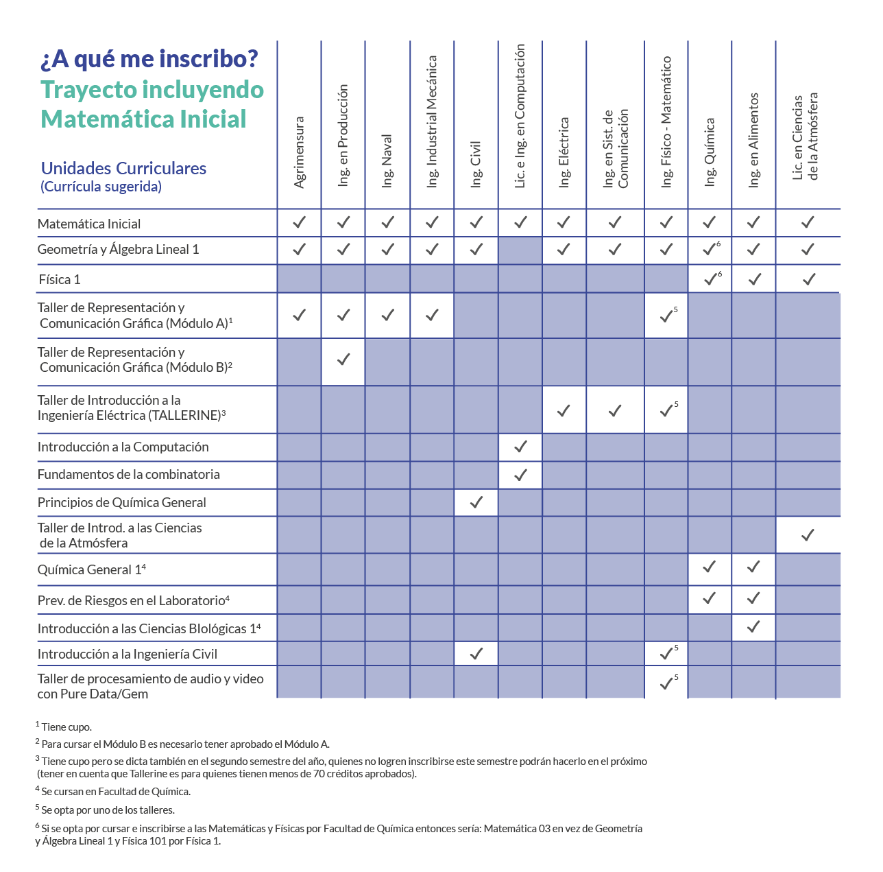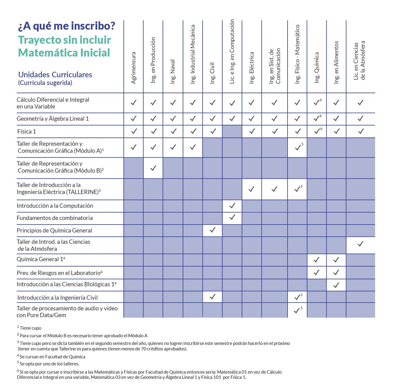 En la siguiente tabla por cada carrera se muestran las unidades curriculares (cursos) a los que se deben inscribir: