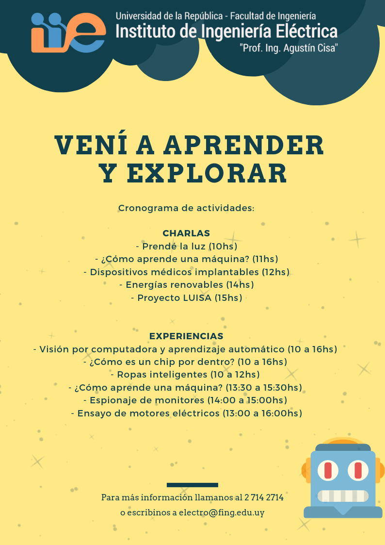 El jueves 23 de mayo la Facultad ofrecerá una Jornada de Puertas abiertas, donde el IIE estará participando con charlas para niños y jovenes sobre la Ingeniería Eléctrica y en Agrimensura se recibirán grupos para conocer sobre las carreras, muestra de instrumental y del software asociado a esa rama de la Ingeniería. La jornada contará con charlas de media hora y experiencias interactivas.